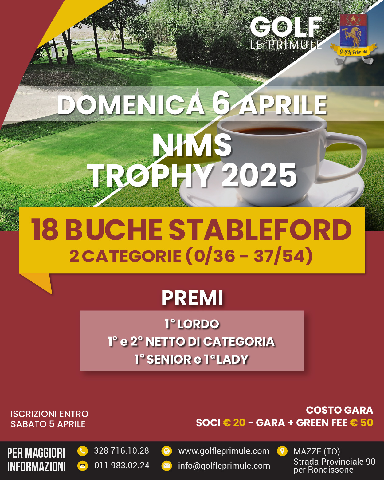 Golf Le Primule- Strada Provinciale 90 per Rondissone, Mazzè☕⛳ NIMS Trophy 2025 – Domenica 6 Aprile 🏌♂✨ 📍 Ti aspettiamo per un’altra grande sfida sul green...con una gara 18 buche Stableford! 🏆 In palio premi per: ➡ 1°…